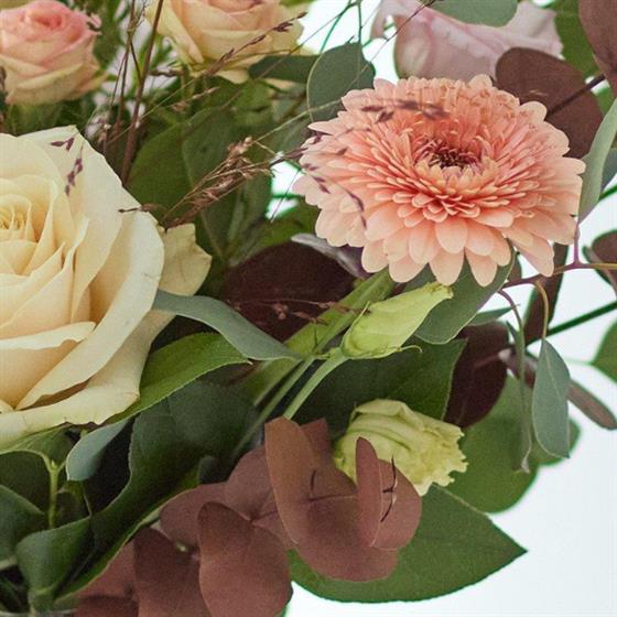 An exquisite array of blooms perfectly arranged in a vase handblown in Europe. It'll feature gorgeous blooms, foliage and dried flowers in muted colours like terracotta or silvery green.
