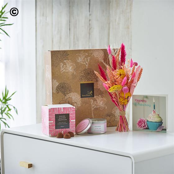 A proper birthday treat, this gorgeous gift box includes scrummy salted caramel flavour truffles, a Garden rose scented candle, and an extra cute cupcake card. It also comes with a selected of pretty pastel dried flowers, chosen by a florist.