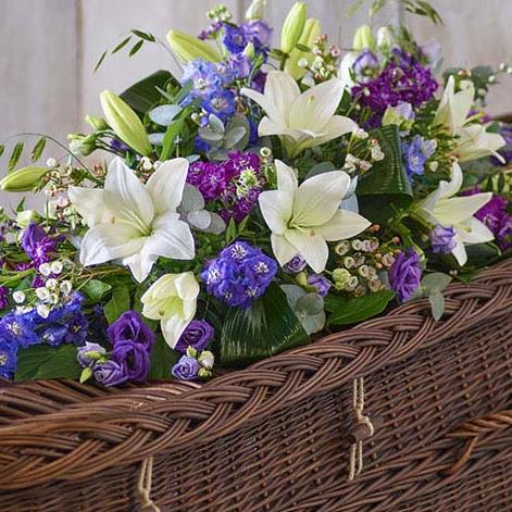 A beautiful array of blue, purple and white blooms including delphiniums, lilies and stocks.