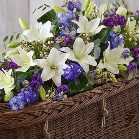 A beautiful array of blue, purple and white blooms including delphiniums, lilies and stocks.