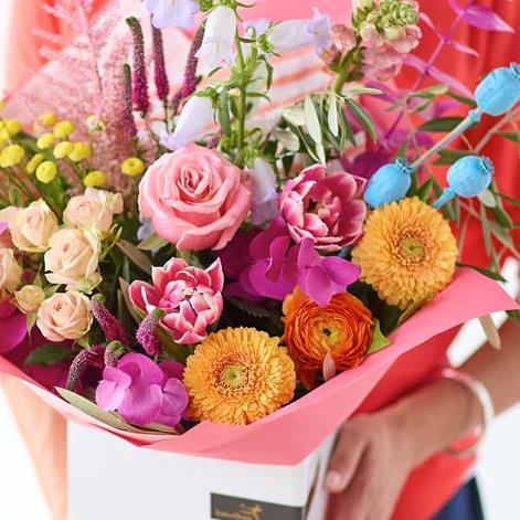 A gorgeous bouquet of fresh flowers, expertly chosen, arranged and delivered by the florist. This year our Mother’s Day designs are all about gorgeous pastels with pops of colour. Expect to see shades of baby pink, cream, and lemon with bursts of cerise and tangerine, and highlights of pale blue and lilac.