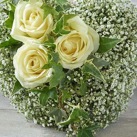 A heart tribute of green and white featuring delicate gypsophila and white roses.