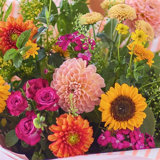 A beauty of a handmade bouquet with flowers in vivid colours plus at least three stunning dahlias.