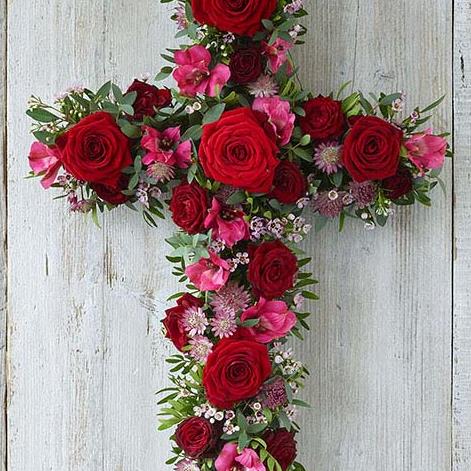 A cross featuring rich red and pink blooms including roses, alstroemeria and astrantia.