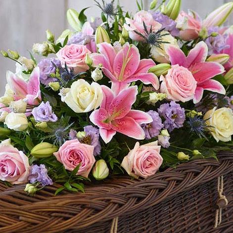 One of our most popular designs, this casket spray is a profusion of pastel blooms including pink and ivory roses and pink oriental lilies.