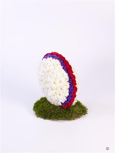 This three dimensional floral tribute is created in the shape of a rugby ball using fresh flowers. White double spray chrysanthemums, red spray carnations and purple statice give the ball shape and colour, and the display is mounted on a moss-covered base
