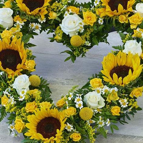 A bright mix of striking sunflowers, roses and craspedia in an open heart design.