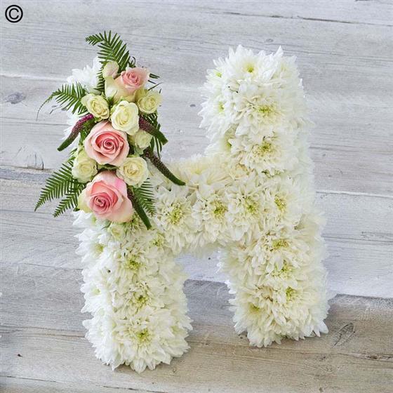 This elegant tribute is crafted using white chrysanthemums with a pink finish, a beautiful tribute to your loved one. Please select the appropriate number of letters.