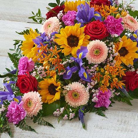 A beautiful, vibrant teardrop shaped mix featuring sunflowers, irises and germini.