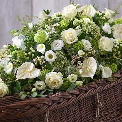 A beautiful casket spray in classic green and white colours, with the finest roses, calla lilies, anthurium and viburnum opulus.