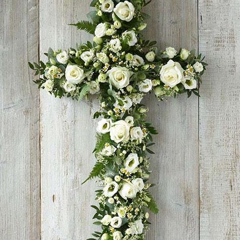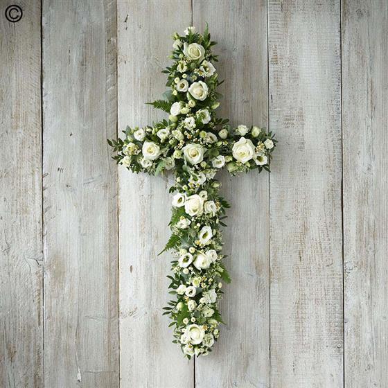 An elegant cross that contrasts an array of white blooms, including roses, chrysanthemums and limonium, with beautiful foliage.